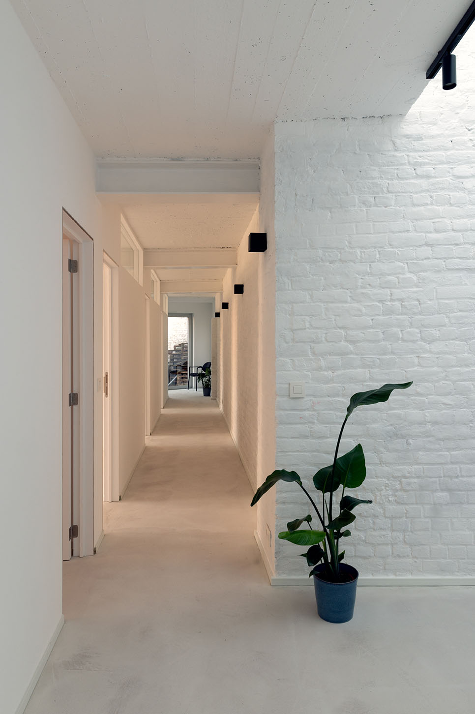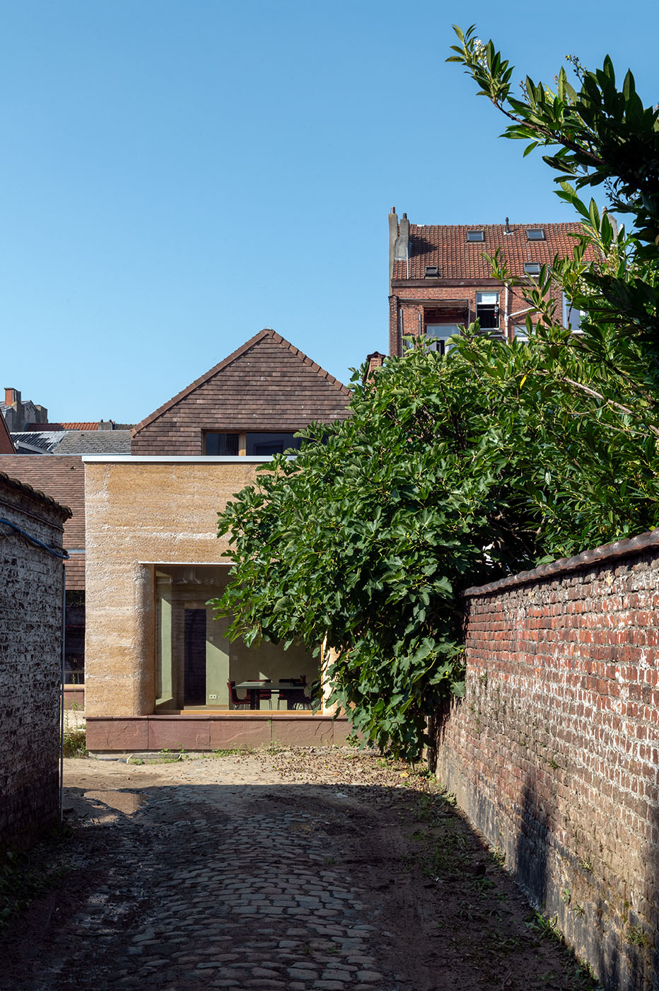 Le projet GROW réinvente un ancien site composé de garages et d’écuries désaffectées en un espace de vie et de travail partagé, accessible par une allée pavée depuis la rue.