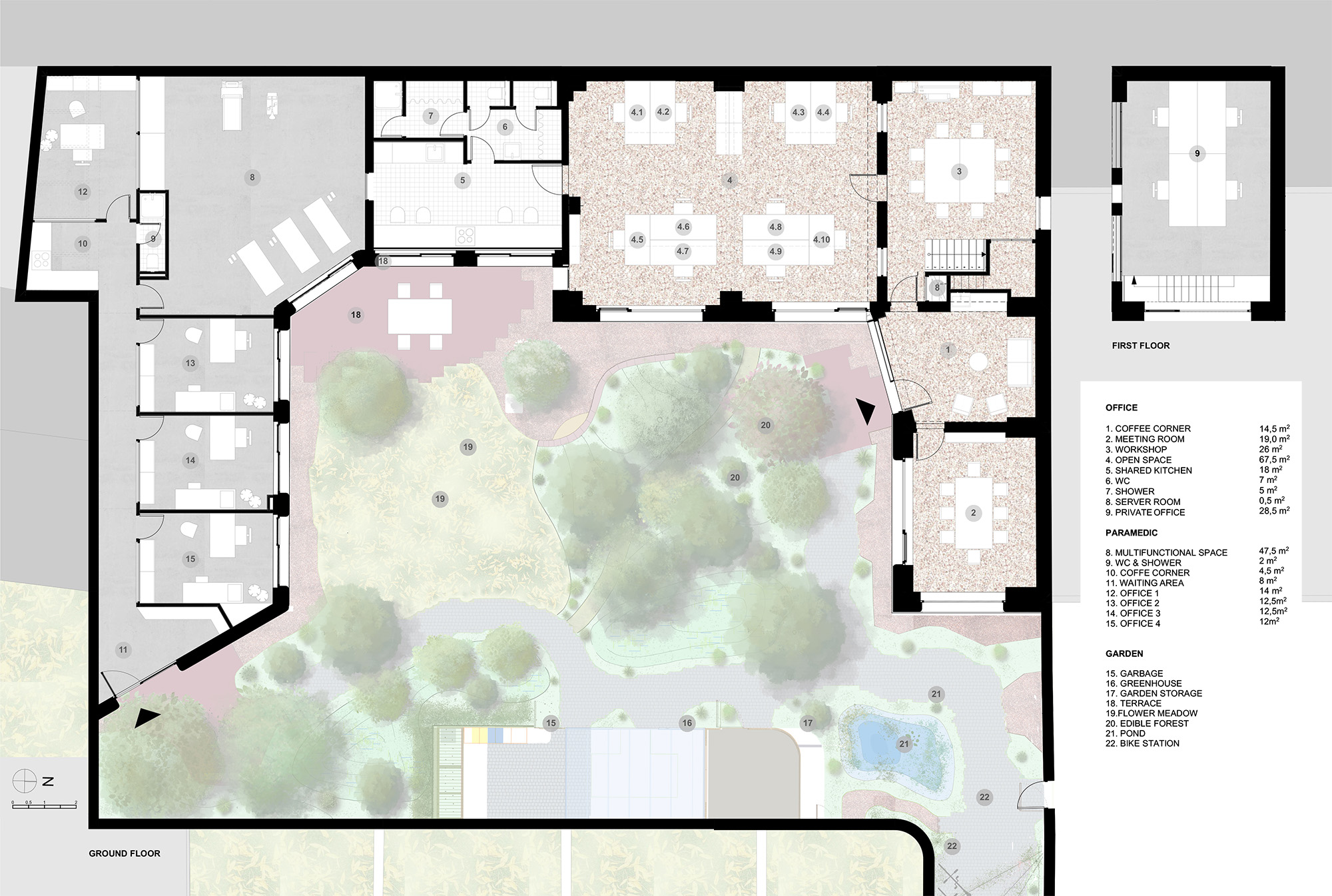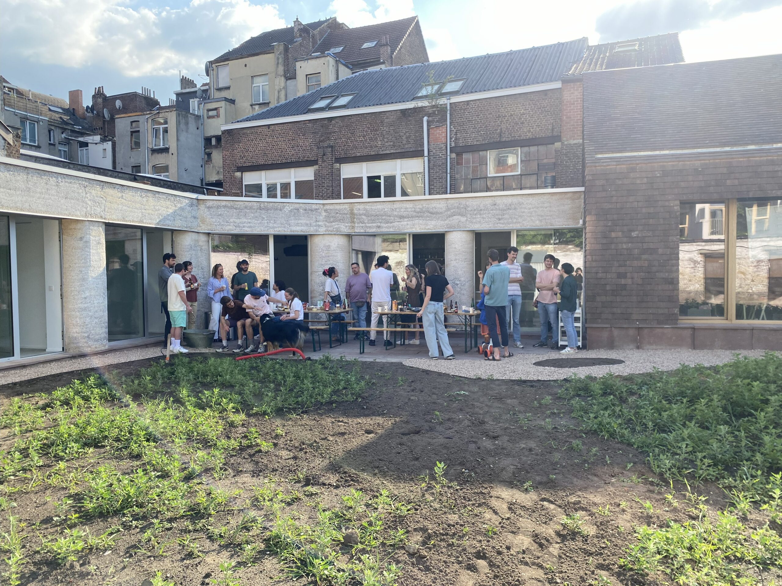 Le programme accueille des espaces de coworking, des bureaux d’architecture, des cabinets paramédicaux et une grande salle polyvalente, tous reliés par un jardin central partagé. Ce dernier inclut des aménagements variés, tels qu’une micro-forêt comestible, des prairies fleuries, une mare et un potager, qui permettent d’initier les habitants et les écoles voisines à la permaculture et aux pratiques écologiques.